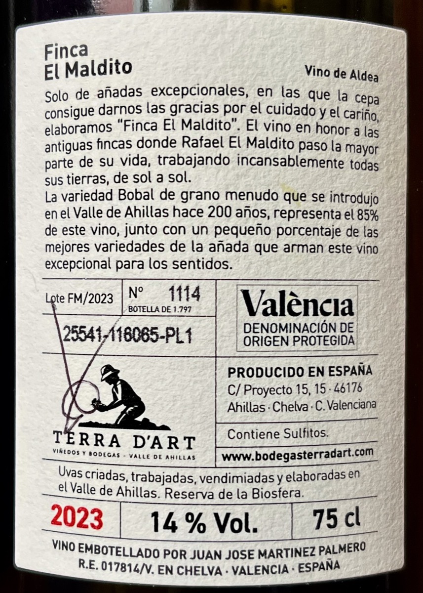 Tan solo cuando “el terroir” y la añada lo permite, y realizando una gran selección de algunas parcelas puntuales, surge el vino “Finca El Maldito“. Un vino del que en la actualidad sólo existen pocas añadas, y que ha salido al mercado con 1.797 botellas, cuando la familia Martínez Palmero decide cuál es el momento óptimo para el consumo. Este vino es un sencillo homenaje al hombre que cuidó y cultivó las parcelas donde hoy se encuentran la bodega y sus campos. Un hombre duro, como Rafael “El Maldito”, que vivió durante 104 años en Ahillas. Contiene sulfitos. |