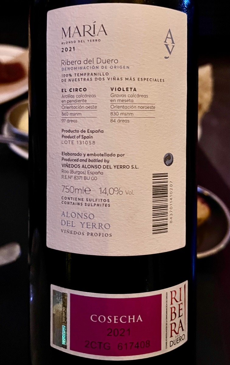 Alonso del Yerro María es el vino insignia de Viñedos Alonso del Yerro, elaborado exclusivamente sólo en las mejores añadas, una muestra de la dedicación y pasión que la bodega pone en cada cosecha. Este tinto procede de dos parcelas específicas de la finca en Ribera del Duero: El Circo, una ladera arcillosa que aporta profundidad y estructura, y Violeta, un suelo de gravas calcáreas que dota al vino de elegancia y notas florales. La viña, situada a unos 800 metros de altitud, fue plantada en 1989 y destaca por la riqueza y madurez que transmite al fruto. La vendimia es manual y tardía; la uva de cada parcela se fermenta por separado en fudres o depósitos de madera de 60 hectolitros con intervención mínima para dejar expresión al terruño. El vino envejece entre 15 y 18 meses en barricas de roble francés (un 20% nuevas) antes de embotellarse. |