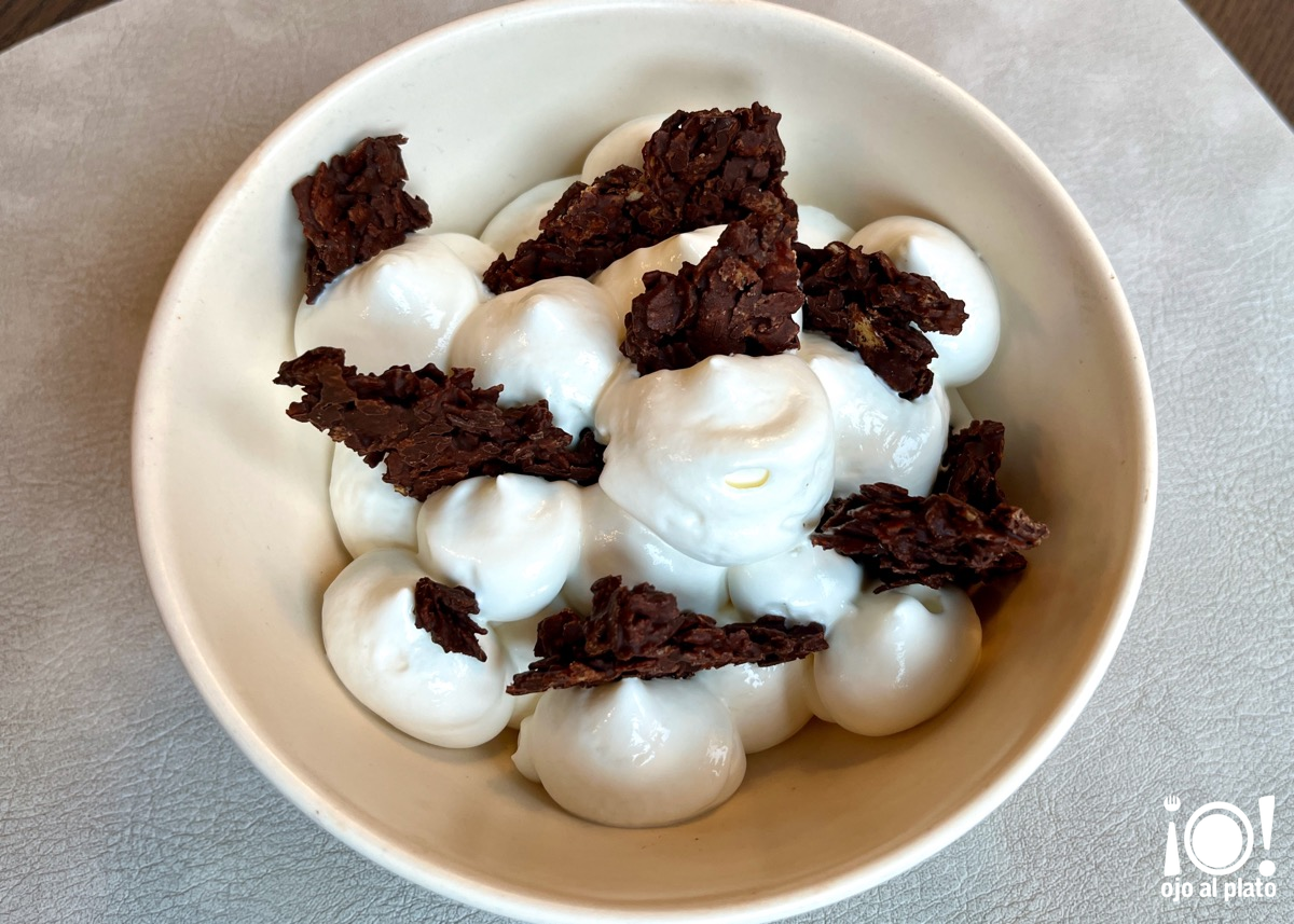 Helado de chocolate, espuma de Piktolín, rocas de Felluti y chocolate negro.