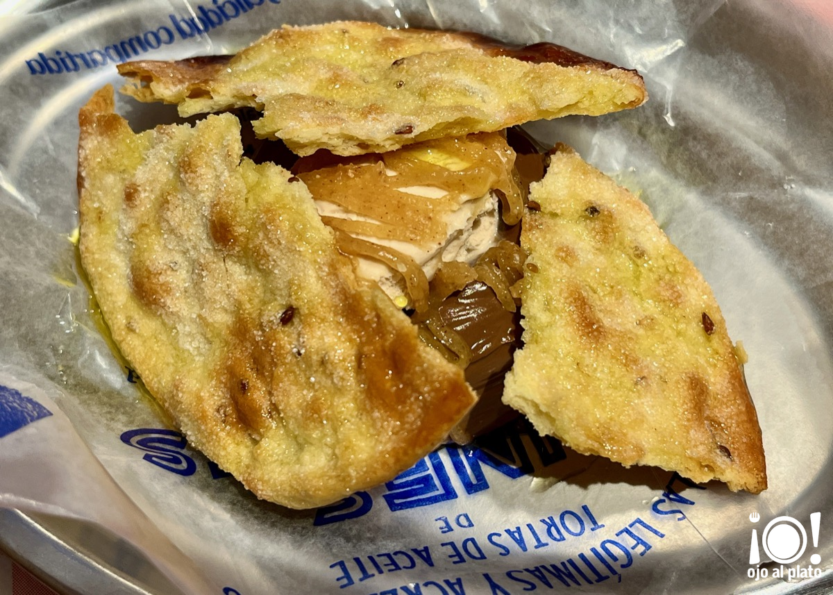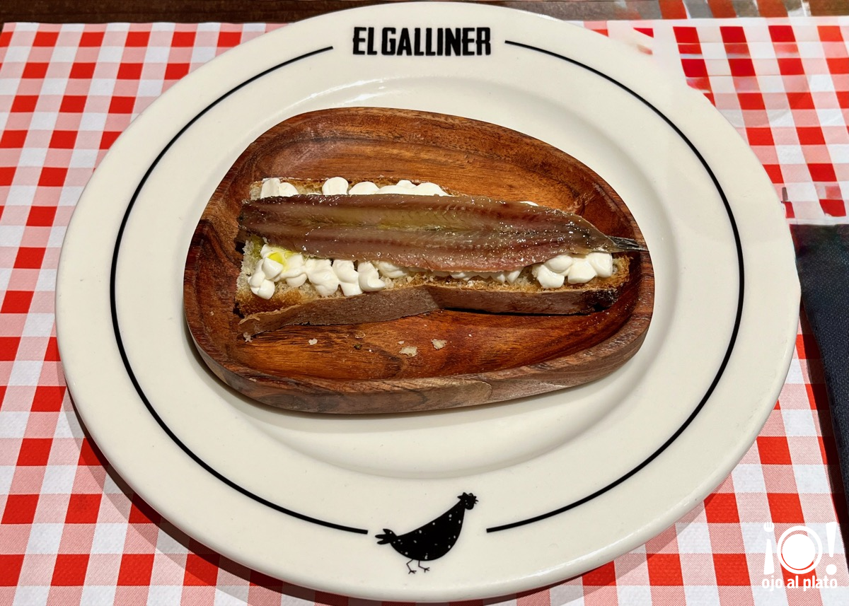 Empezamos con un "Prim de anchoa con queso y crema de ajos", que consiste en una base de algo que no es pan pero es similar a una especie de panquemado o roscón de reyes, sobre el que van colocados los ingredientes y encima una anchoa mariposa, es decir con los dos lomos juntos, una anchoa entera, no media como se suele servir. La experiencia de la anchoa sobre mantequilla, una buena mantequilla, es espectacular, esta otra no se queda atrás, es de sabores más sutiles, aún con la crema de ajo. Este era un comienzo muy prometedor.