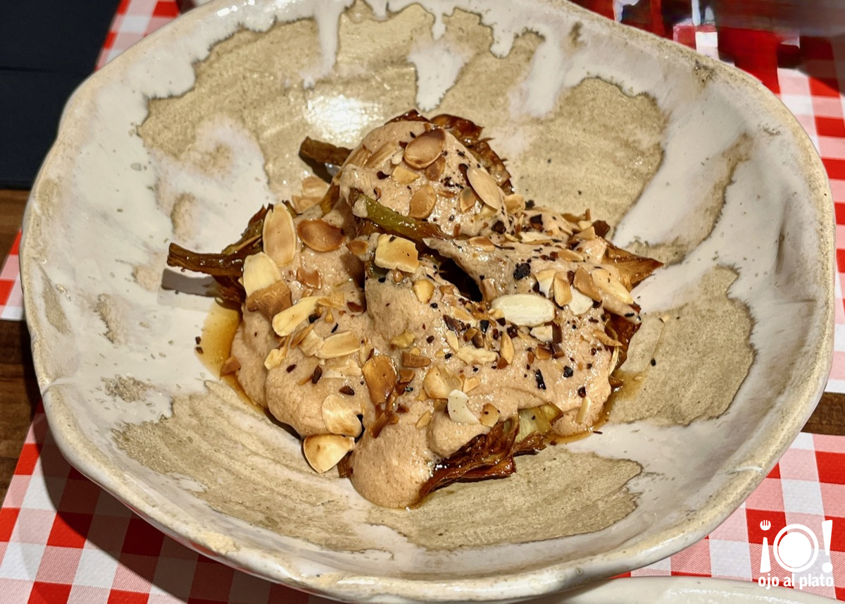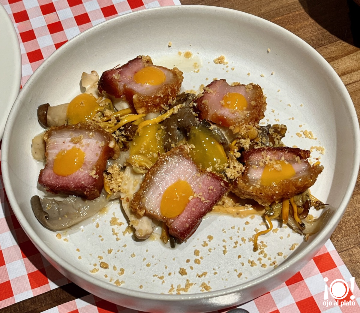 El siguiente plato figuraba fuera de carta, había varios de ellos, hay que preguntar siempre, son platos del día que seguramente vale la pena probar alguno de ellos. Este consistía en unas "Habas picantes con yema de huevo, guanciale y ralladura de corteza de cerdo", un plato que sorprende y que convence, con una combinación de sabores inusual pero que encajan muy bien. Aunque básicamente son habas con cerdo, pero con chispa, presentadas de forma diferente.