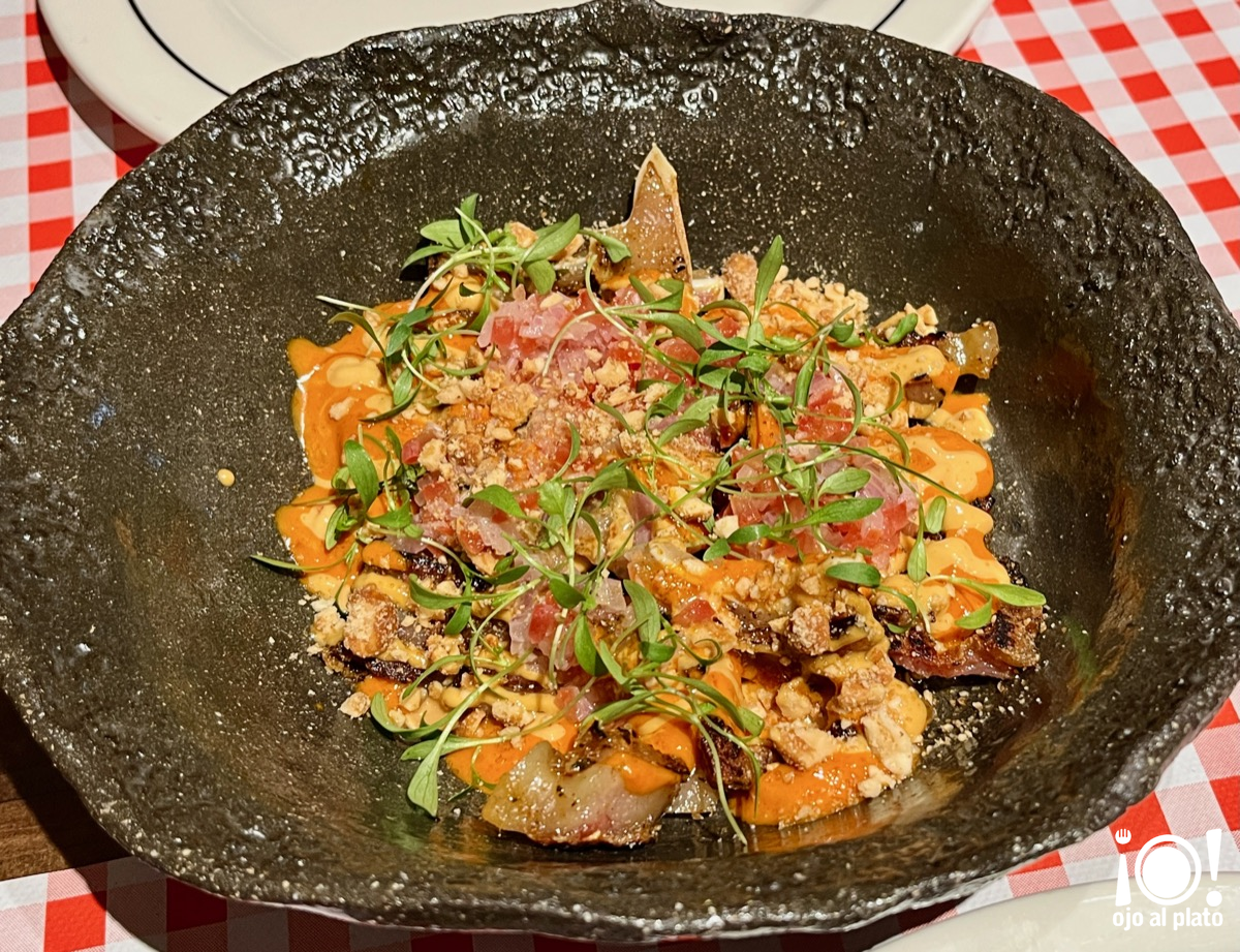 Se dice que del cerdo hasta los andares, pues eso pensamos ese día nosotros, seguimos con otra tanda más de este "hermoso" animal, "Oreja a la plancha con mojo", llevaba también germinados, frutos secos y un poco de guindilla roja picada que le daba un interesante "puntito". Estupenda la oreja y muy vistoso el plato, con una variedad de texturas y sabores muy apropiada.