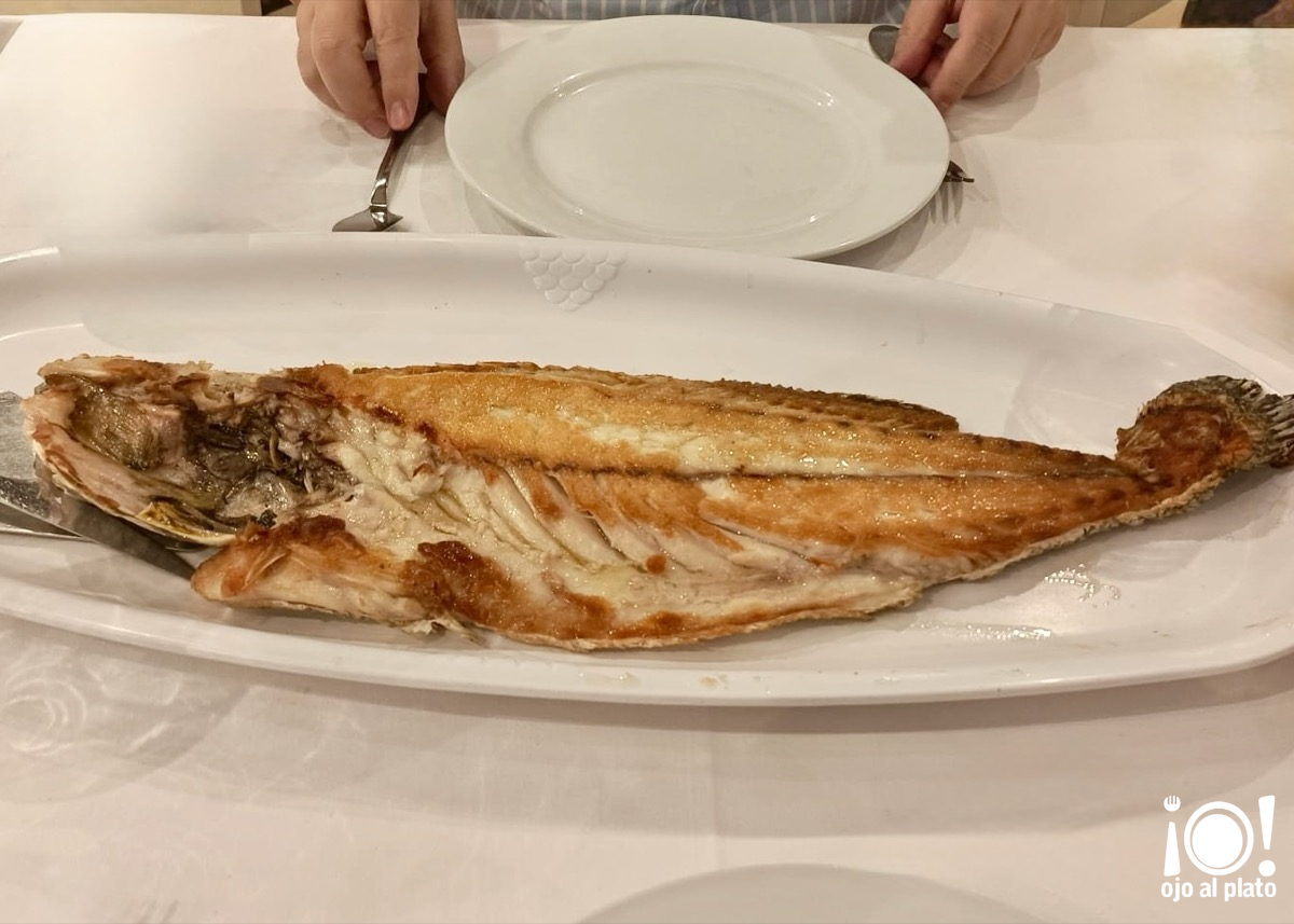 Del plato que no se puede prescindir en Casa Eusebio es de la lubina especial a la plancha con un toque final de horno. Sale perfecta y está suculenta. En pocos sitios se encuentra un pescado como este, por tamaño, más de dos kilos la pieza entera, y por sabor y calidad. Esta mitad, según factura, pesaba 1,2 kg. Se aprecia perfectamente el tamaño en comparación con el plato y mis manos.
