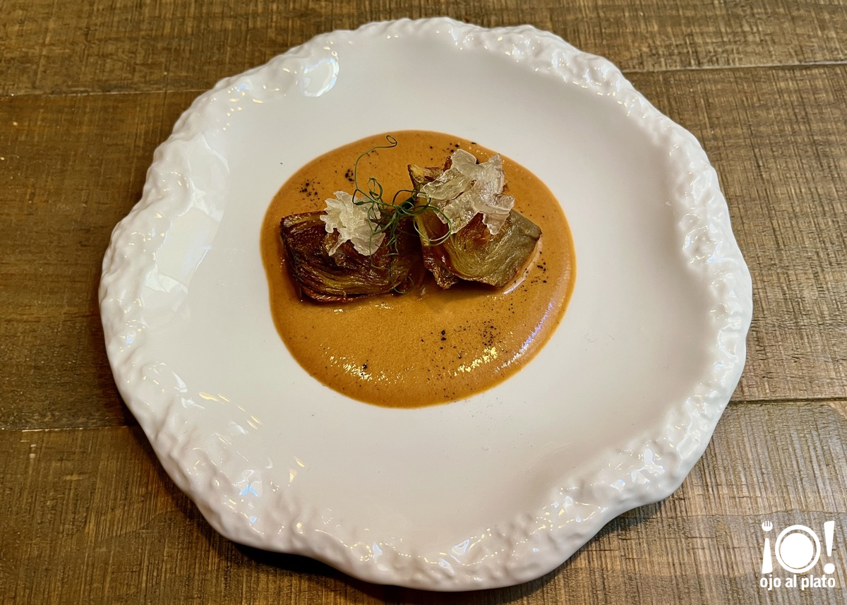 Alcachofa confitada durante una hora y luego frita, velo de tocino, con una natilla de sobrasada que previamente ha sudado dos horas en el horno para eliminar la mayor parte de la grasa. Un plato espectacular, de mis preferidos.