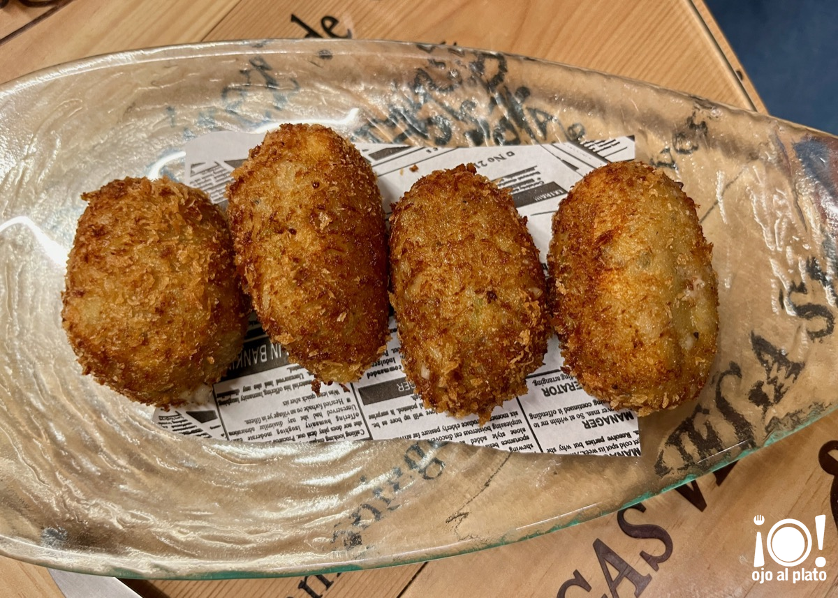 Llámame clasicón, pero las croquetas son otra de las tapas que a casi todo el mundo le gustan. Estas que estaban hechas con la masa de cocido fueron muy halagadas por los que las probaron, por mí también. Crujientes por fuera, se aprecia perfectamente, y cremosas por dentro.