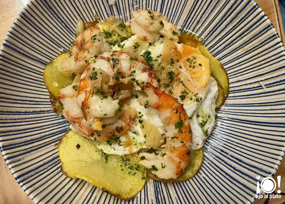 Este plato lo tiene casi todo y puede hacer las delicias de cualquiera "Gambas al ajillo con patatas y huevo frito". Si las patatas con huevo son un bocado sencillo pero exquisito, al añadirle las gambas al ajillo, gambones en este caso, sube de categoría. Dos platos maravillosos en uno, sigue siendo más maravilloso.