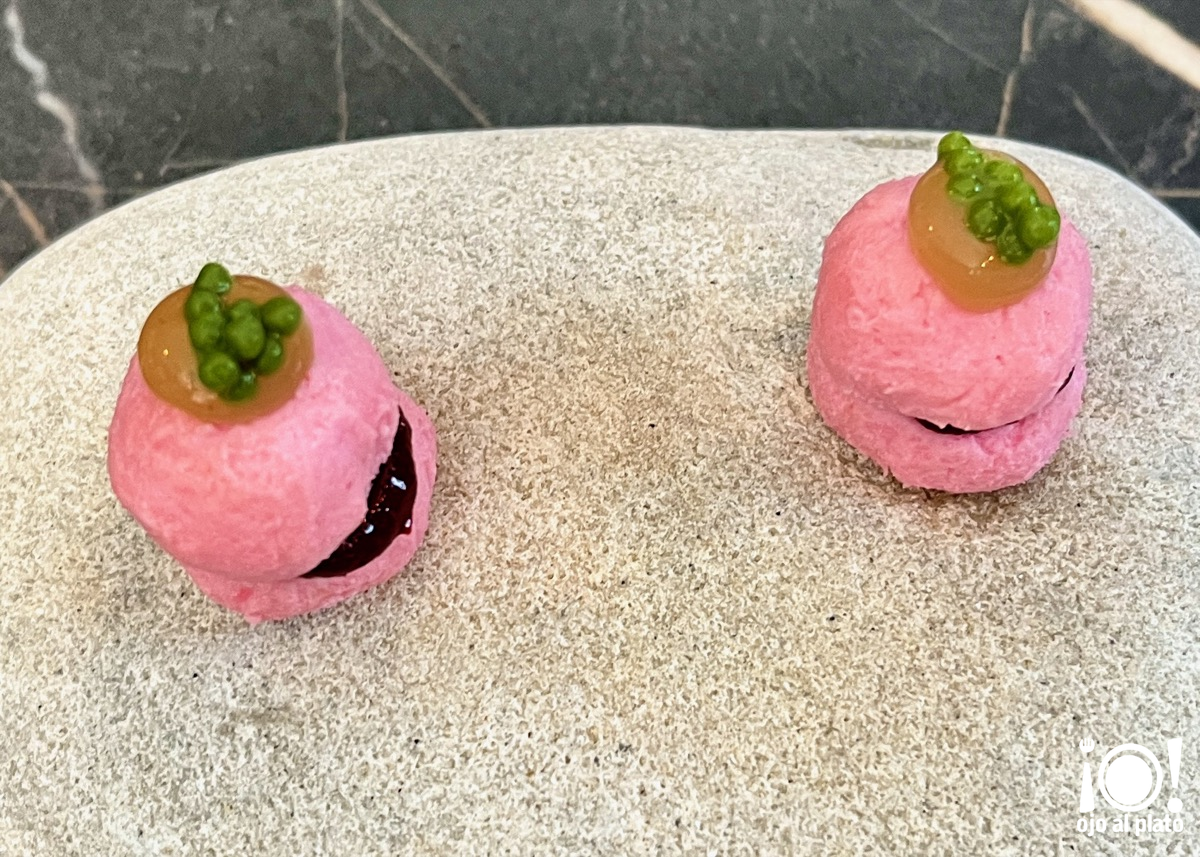 Empieza el festival con un macaron de queso Comté relleno con mermelada de pimientos del piquillo, encima lleva un gel de uva con un toque picante y miel y unas perlitas de wasabi. Un bocado delicado pero con mucho sabor, sutileza y gusto. Cuatro elaboraciones y cuatro sabores armonizados en un suspiro.