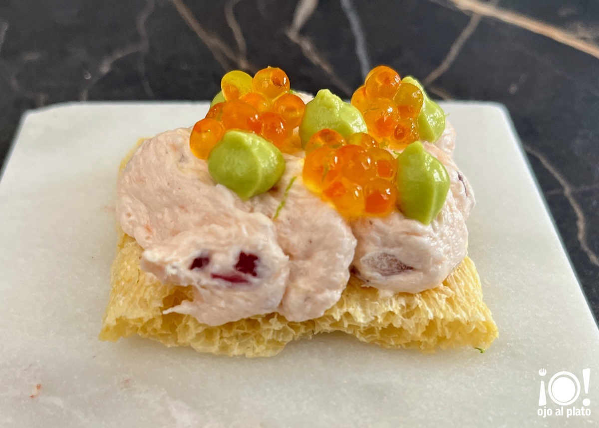 Junto con el bocado anterior llegó a la mesa este suflé de lentejas con rillette de salmón. La rillette está hecha con salmón al horno, philadelphia y cebolla morada. Lleva unos puntos verdes que son de puré de aguacate con un toque de lima, junto a ralladura de lima y perlas de salmón. He contado cuatro elaboraciones también, en un bocado etéreo, que es toda una exquisitez.