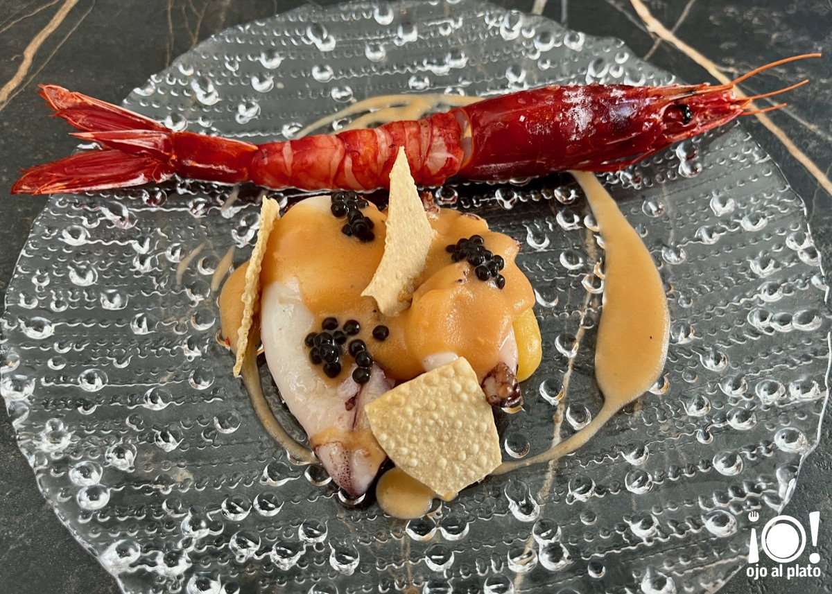 Es difícil distinguir un plato sobre los demás, pero este creo que es el que tendría más posibilidades, sobre todo por la materia prima que se ha utilizado y la sutileza con la que se ha tratado. Lleva unos calamares que se han pasado ligeramente por la plancha. La crema es una parmentier, que es un puré de patata hecho con una infusión de mantequilla. Y además lleva ajo, romero, tomillo, estragón, un poco de eneldo, un suquet de cigala y gamba roja, y está decorado con unas perlas de esturión. El crujiente es un papadum, que está hecho con harina de lentejas y especias y venía acompañado con un hermoso carabinero. Nos chupamos los dedos sin recato.
