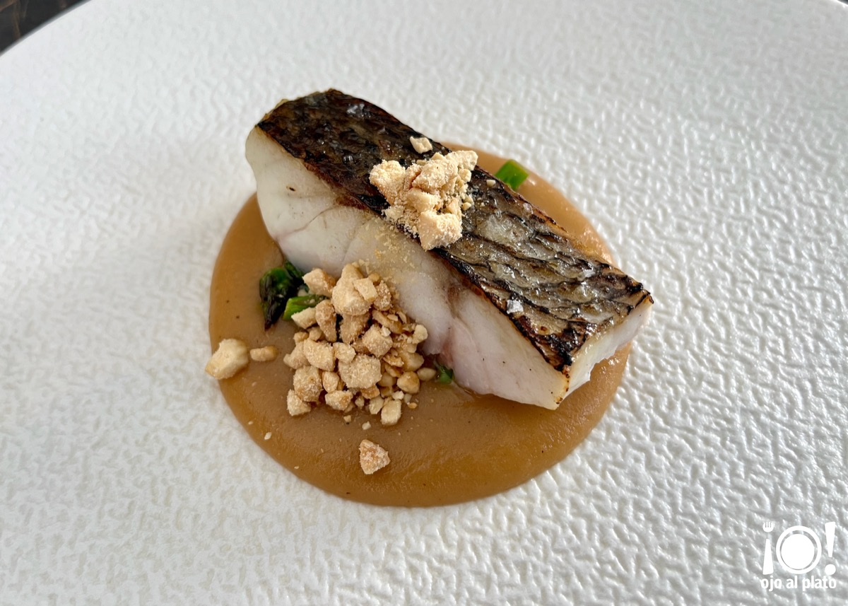 El siguiente plato fue la corvina. La base es una crema de nabo con nabicol. Lleva también unos espárragos trigueros que están salteados con lima y unos anacardos troceados. Este podría ser el plato más simple y tiene su excelencia. Te aseguro que estaba riquísimo.