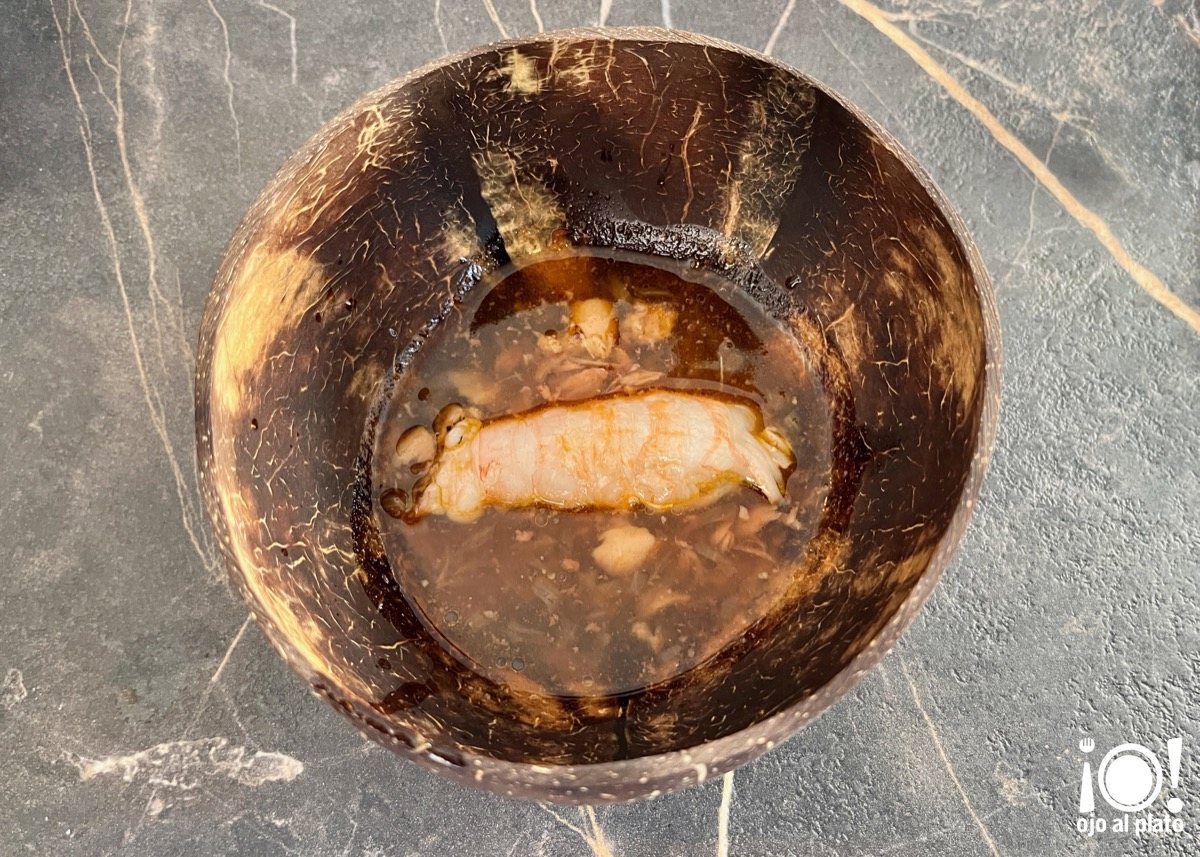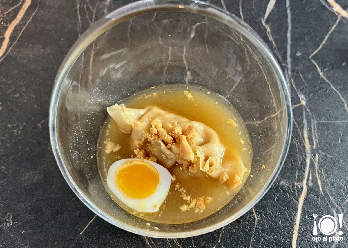 Todo lo que se puede hacer con una codorniz. Una gyoza cocida en un caldo de codorniz a la brasa. Con la misma carne del caldo se ha hecho el relleno de la gyoza añadiendole un poco de pimiento, algo de salsa hoisin, salsa de ostras y cebolla, la acompaña un huevo mollete de codorniz y cacahuetes picados. Nos recomendaron comer la gyoza de un solo bocado, pero yo desobedecí y me la comí poco a poco para que me durase más. Fue un acierto.