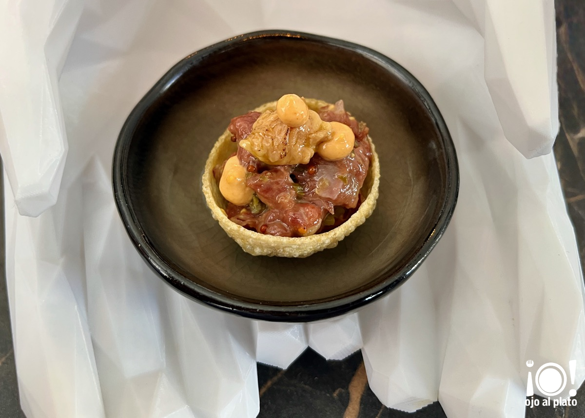 Hasta los bocados más pequeños tienen su grandeza como este panipuri relleno con un steak tartar hecho de pato, con mayonesa de curry rojo y foie. Sé que te estás relamiendo y tienes motivos, está espectacular.
