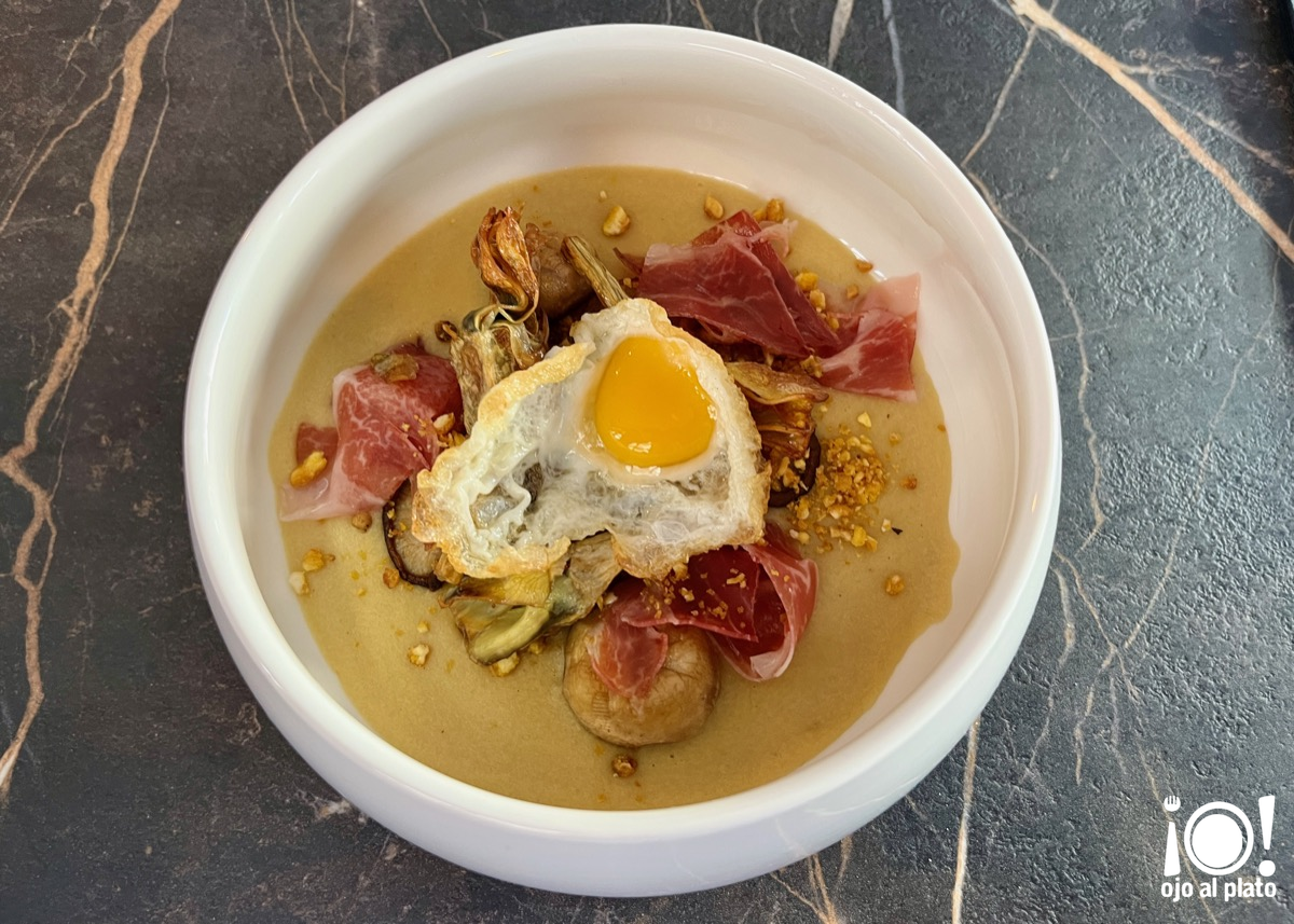 El siguiente plato contenía una crema de queso Comté en la base. También llevaba unas patatas hervidas y luego fritas. Unas setas salteadas, portobello y shiitake, jamón ibérico, un huevo de codorniz, polvo de maíz frito y alcachofas crujientes. Excepcional, me hubiera comido una docena como este.