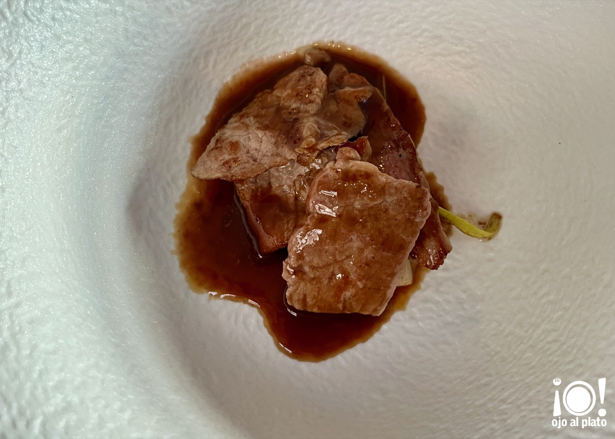 El noveno plato era una presa ibérica, con unos ajos tiernos marinados con soja y jugo de carne en el fondo. La ternura de esta carne es una caricia para el paladar. Fantástica.
