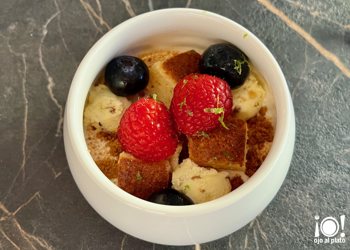 El postre consistió en una sopa de chocolate blanco con anís estrellado y queso mascarpone. Lleva galleta Lotus desmenuzada, un bizcocho de chocolate blanco, frambuesas, arándanos, ralladura de lima y helado de vainilla y caramelo. Delicioso, muy variado y completo, contiene casi todas las texturas y muchos sabores.