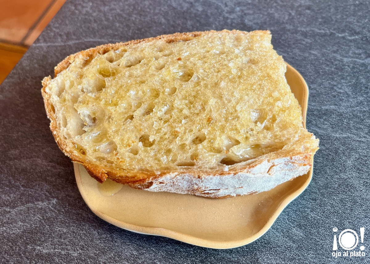El pan que sirven no es cualquier cosa, se han preocupado de encontrar el mejor posible, y realmente está muy bueno. Lo hace un obrador de Gandía que se llama Cruixent. Es un pan de masa madre que se sirve cubierto con una mantequilla negra, una mantequilla que dejan tostar varias horas a fuego lento y después se infusionan en ella varias hierbas, Tomillo, Romero, Salvia y Orégano fresco. Repetirás.
