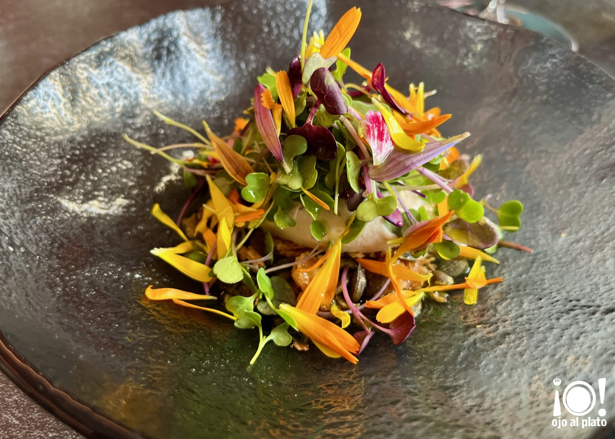 Empezamos con una ensalada de brotes tiernos y flores, un helado de foie de mar, manzana y pipas de calabaza. Para empezar te plantean un reto, que intentes adivinar de qué está hecho el helado. No te lo voy a desvelar para no estropear el juego. Ánimo que lo sabrás reconocer.