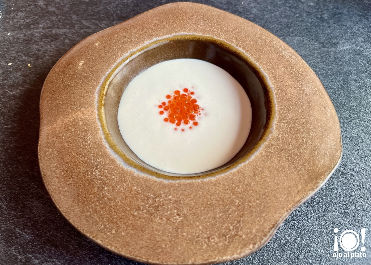 Continuamos con una crema de almendra marcona. Está hecha simplemente con la almendra cruda, agua, sal y un puntito de vinagre. Se acompaña con huevas de trucha que le dan el punto salino al plato. Muy refrescante, sedosa y agradable. Es algo más sencilla, en cuanto a sus ingredientes, que el ajoblanco andaluz.