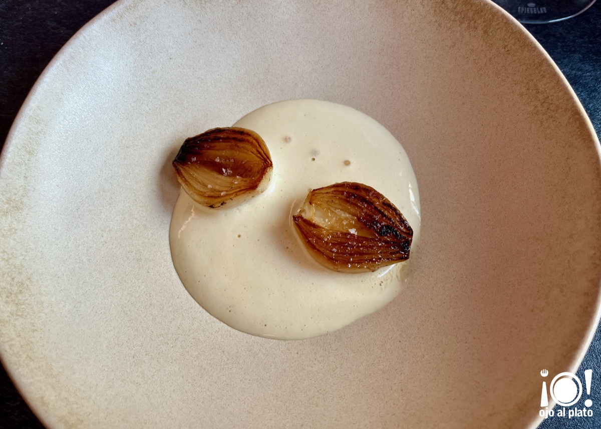 Este es un plato que lleva en el restaurante, dos años, desde que abrieron y se sigue manteniendo en los menús. Es una cebolla dulce que se hace glaseada. Acompañada con una salsa holandesa, que está hecha con yema de huevo, sardina ahumada infusionada y un toque de manzanilla de Sanlúcar. Tienen motivos para mantener el plato en vigor, está muy conseguido, los dos elementos del plato están fantásticos.