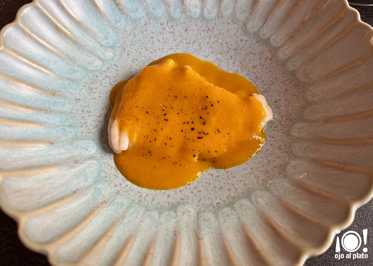 Seguimos con una alcachofa confitada. En la base el caldo es una sopa "laksa", una elaboración típica de Singapur, es una versión menos picante que la original porque nuestro paladar, en general, no está acostumbrado a ese umbral de picante. La base es un caldo hecho con leche de coco y especias aromáticas al que le han añadido un toque de café. Muy interesante y gustoso.