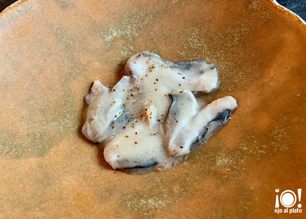Le llega el turno a un plato que tiene más enjundia de lo que parece. Son unos guisantes del Maresme, se pasan muy ligeramente por la sartén para no desvirtuar mucho su textura y sabor. Van acompañados de una mayonesa que hacen con el colágeno de la merluza. Se limpian las cabezas y se dejan toda la noche en un agua con hielo para eliminar impurezas. Al día siguiente se secan bien, se cortan en trozos muy pequeños, se envasan al vacío cubiertas de aceite y las cocinan a baja temperatura durante dos horas. Al colarlo lo que se obtiene es una aceite lleno de gelatina. En este caso se sustituye la proteína de huevo por el propio colágeno que también es una proteína y se monta con su propio aceite de cocción una mayonesa templada, que no lleva más que gelatina de merluza y su propio aceite. Los guisantes tiernísimos y la mayonesa exquisita y muy original.