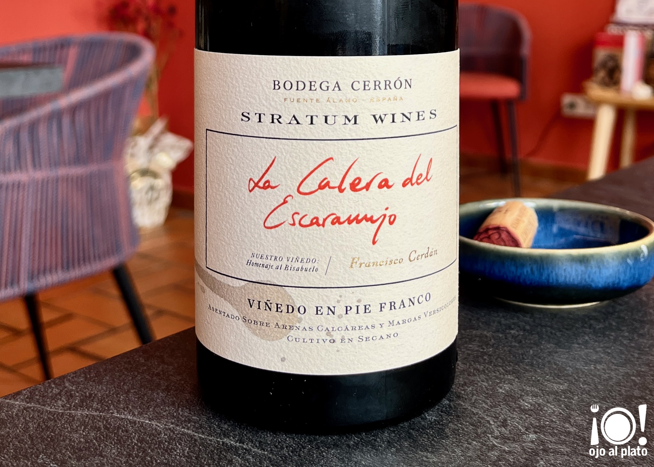 Para acompañar a esta estupenda comida había que elegir un vino a su altura y nos decantamos por este de Bodegas Cerrón de la DO Jumilla. La Calera del Escaramujo 2023 es un vino procedente de vides en pie franco, es decir prefiloxéricas, de la variedad Monastrell en cultivo ecológico, viñedo de 1942 situado a 960 msnm en Fuente Álamo (Albacete), de producción muy limitada, que ofrece un perfil elegante, mineral y fresco. Cautiva con su intensidad y elegancia. En nariz se aprecian sus sutiles aromas florales que se entrelazan con frutas negras. Su perfil es concentrado y su textura aterciopelada llena el paladar, destacando por la frescura que se mantiene gracias a sus taninos finamente pulidos. Una elegante y austera joya de Jumilla.