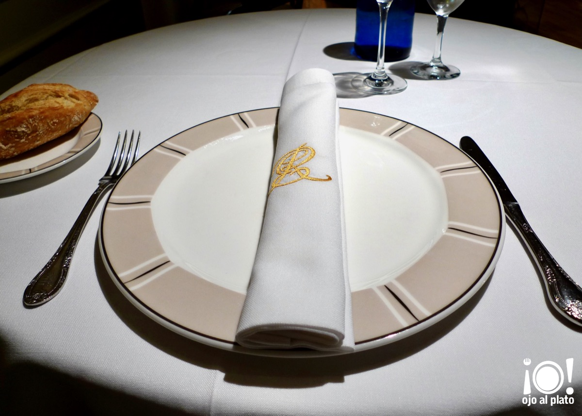Nada que objetar a la preparación de la mesa, cubiertos, platos y mantelerías de primera. Las copas Schott Zwiesel adecuadas, aunque las hubiera preferido de mayor tamaño, por aquello de la buena disposición de las capas aromáticas del vino en el interior de la copa, según el peso molecular de cada elemento volátil. Pero es una cuestión de gustos.