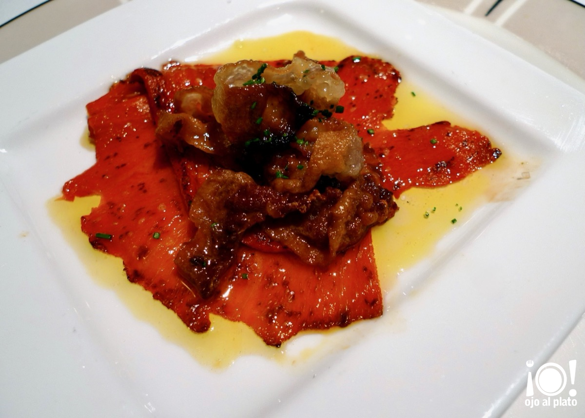 Me decanté por el menú degustación. Es el problema de los restaurantes con muchas cosas ricas y que están tan lejos, que no sabes cuando vas a poder volver, así que cuantas más cosas se prueben de una vez mejor. El festival empezó con un aperitivo de pimientos del piquillo asados y acompañados de bacon tostado.