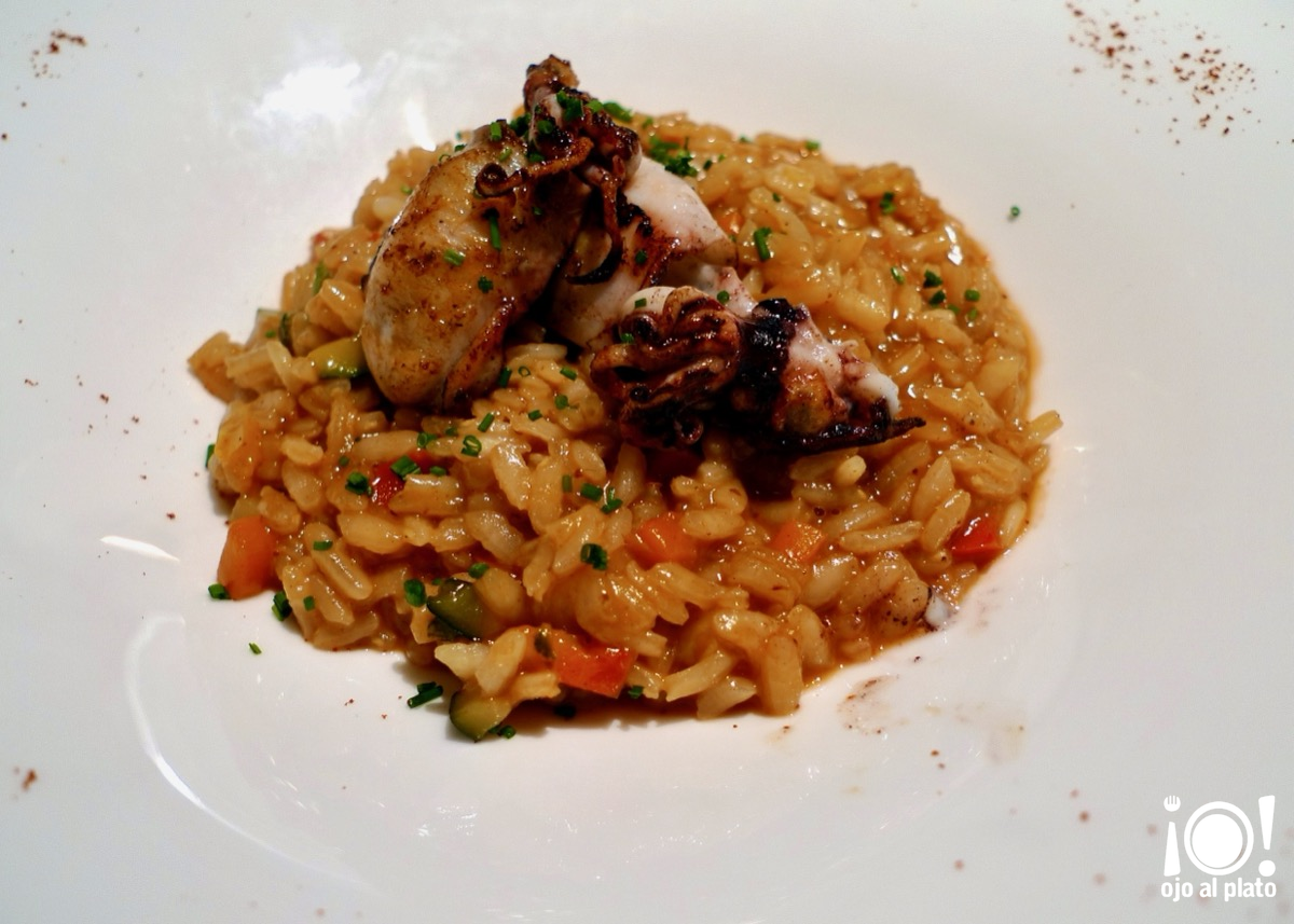 Le siguió un arroz meloso con verduritas y chipirones. A los valencianos nos gusta el arroz y a fuerza de comer acabamos entendiendo algo de ésta gramínea. Pues éste plato estaba muy rico y en su punto, ni blando ni duro ni “al dente” que ese no es un término aplicable al arroz, me lo he comido con mucha satisfacción.