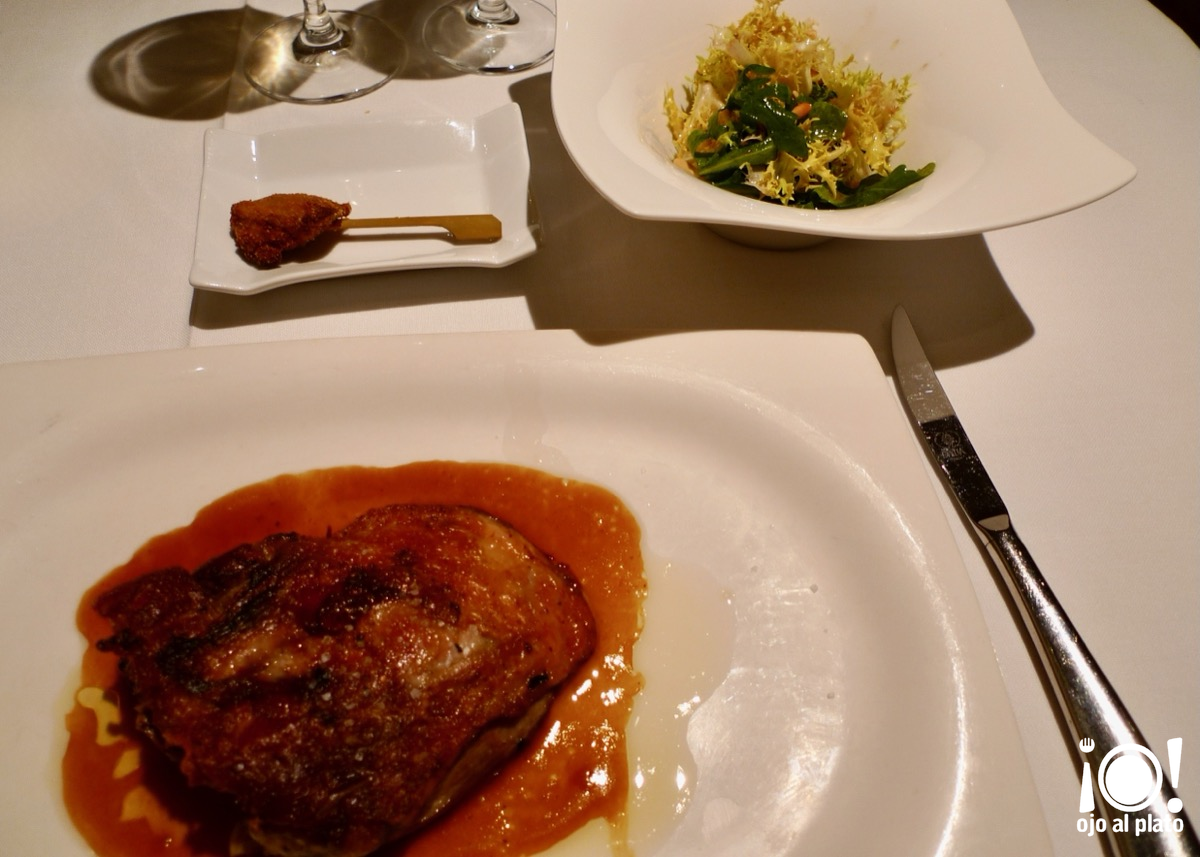 Después una merluza con salsa de maíz tostado, boniato y cigalita crujiente. La merluza estaba muy buena. Tierna, jugosa, delicada y muy fina.