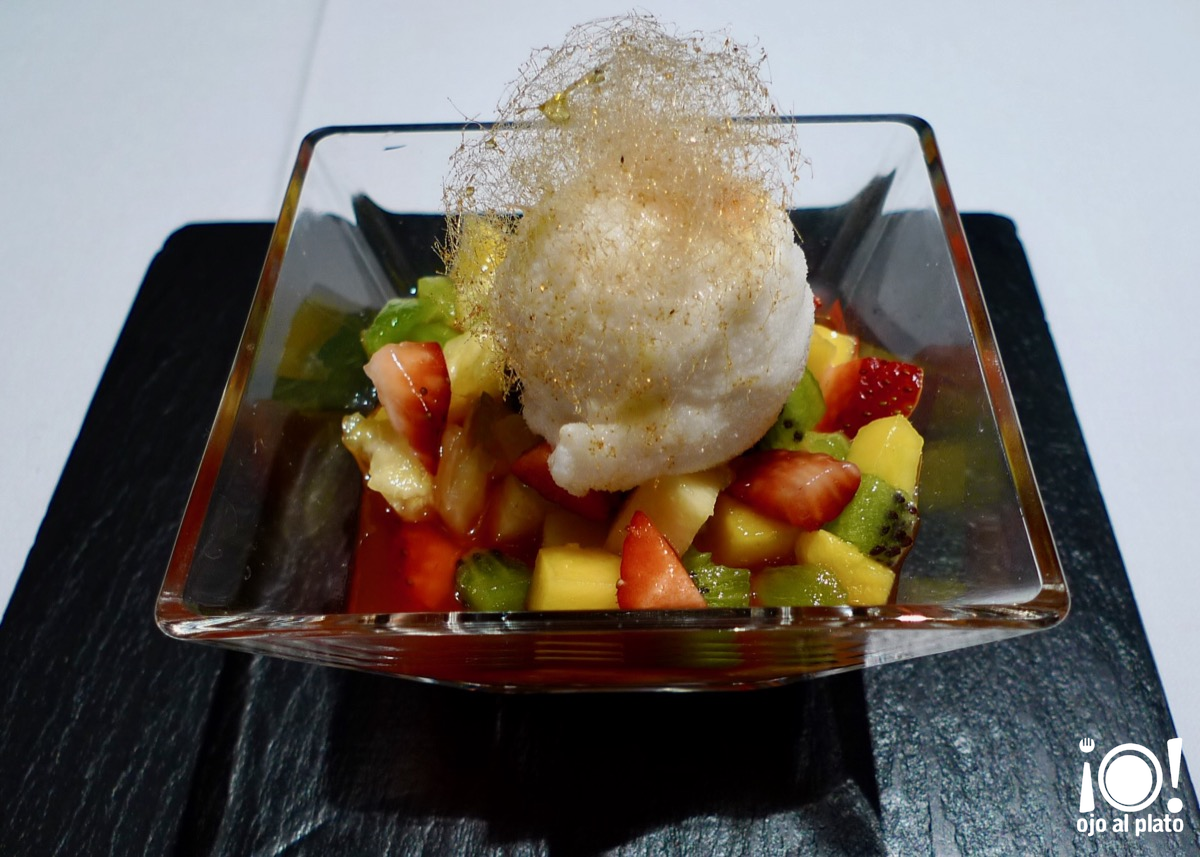 Los postres espectaculares, como todo lo anterior, el primero una macedonia de frutas tropicales, con helado de lichi y un algodón de aceite de la variedad empeltre y en su jugo almendra amarga. Fantástico postre, refrescante y complejo en sabores y texturas.