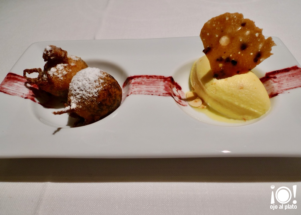 El siguiente fue un helado de naranja acompañado de dos buñuelos redondos rellenos de chocolate. Otros dos contrastes que se complementan por ser tan diferentes. Fantástico.