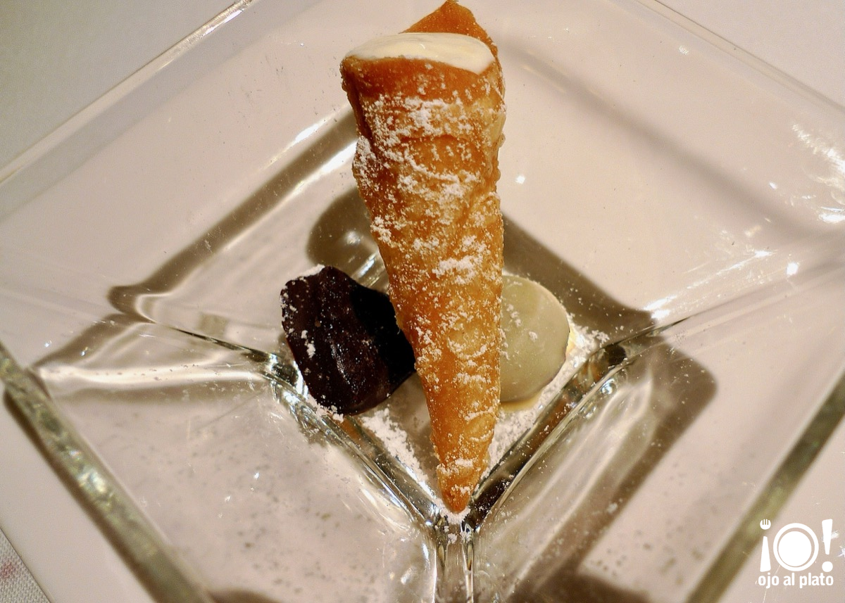 Aquí no había acabado todo, al servirme el café me trajeron esas pequeñas miniaturas de la artesanía repostera, que según los franceses se denominan “petit fours”. En esta ocasión había un canutillo relleno de espuma de cuajada y dos piezas de diferentes chocolates a cual más bueno de los dos.