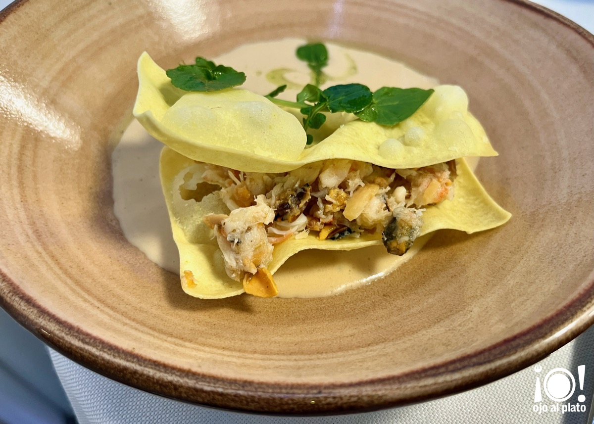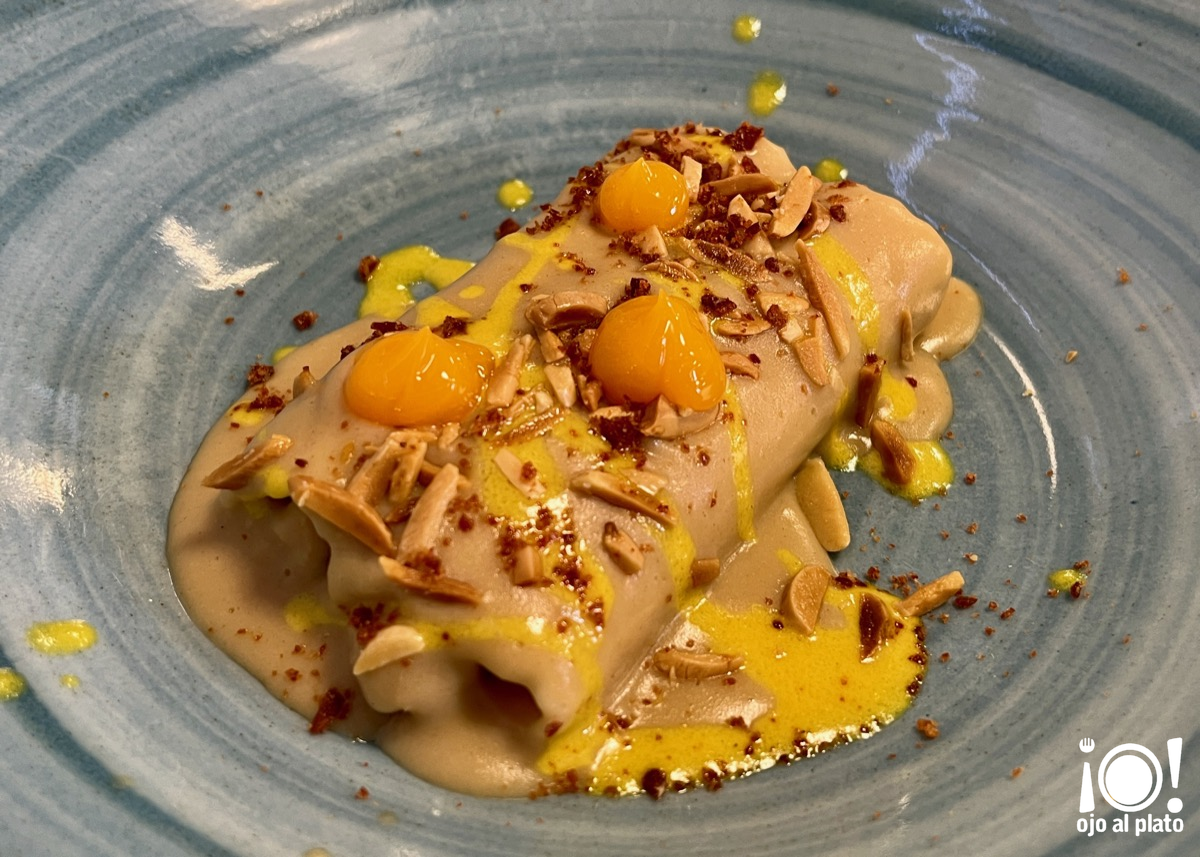 La última de las entradas que pudimos probar fueron estos canelones de gallina en pepitoria, velouté de ave, gel de yema, almendra y sal de jamón de Teruel. Fíjate que entrante más impresionante, parecía un plato principal.