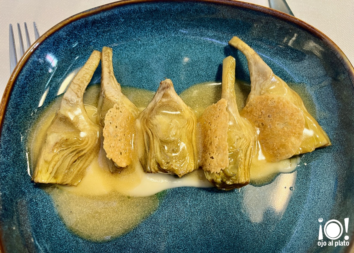 Estas alcachofas salteadas con una base de puré de tupinambo, espuma de meunière y miso y tres tejas de torreznos intercaladas entre ellas, estaban deliciosas.