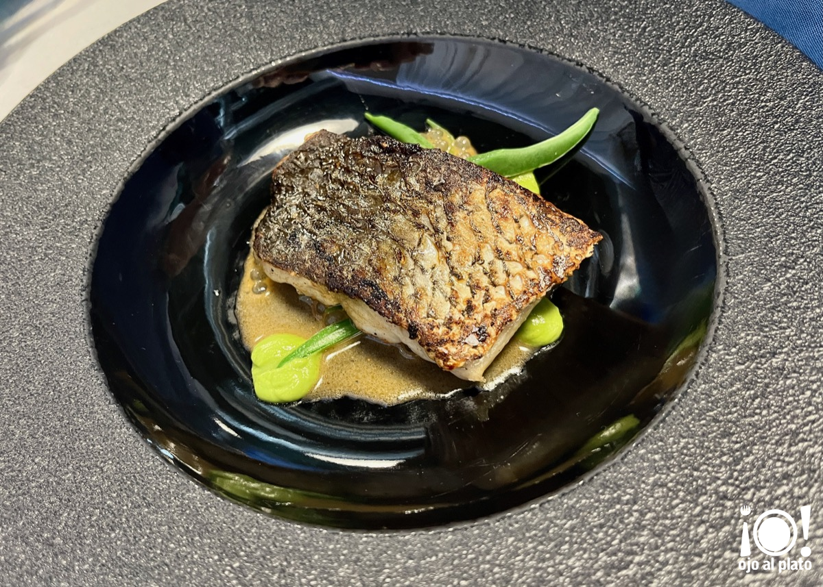 Le llega el turno a los principales, uno de ellos fue esta corvina a la brasa con salsa aromática de crustáceos y emulsión de judía verde Perona. Espectacular.