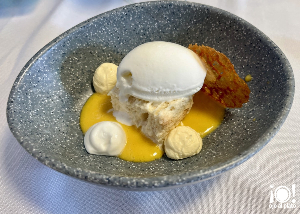 Y el otro fue este "Tres leches" tropical, cremosos de maracuyá y coco, y sopa cítrica. Inspirado en el famoso postre sudamericano que consiste en un bizcocho impregnado con leche condensada, nata líquida y leche evaporada. Pero aquí venía muy bien refrescado con las frutas tropicales.