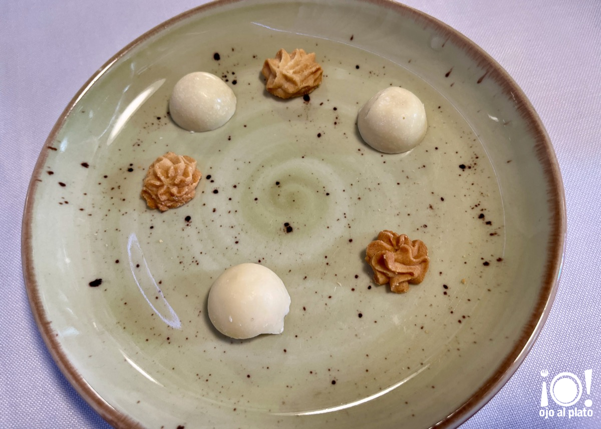 Como petit fours nos sirvieron unas semiesferas de coco y una espuma de algarroba y caramelo. Deliciosos.