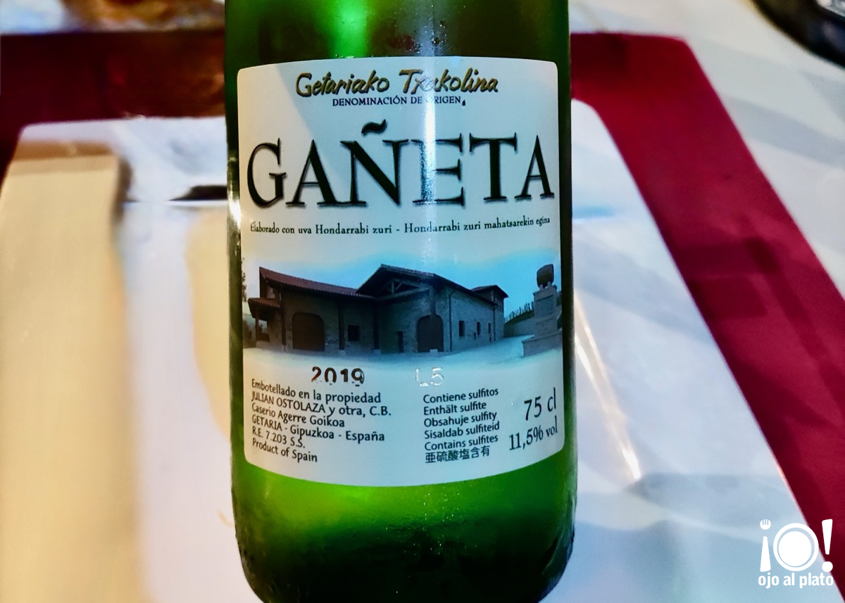 Para beber en las dos ocasiones tomamos este Gañeta, un "Getariako Txakolina" clásico. Elaborado 100% con la variedad autóctona Hondarrabi Zuri. Tenía un aroma abierto, con mucha fruta, que nos recordaba a cítricos y frutas exóticas. Y un paso por boca, redondo, agradable y persistente. Con un final intenso y ligeramente ácido. Interesante y muy agradable.