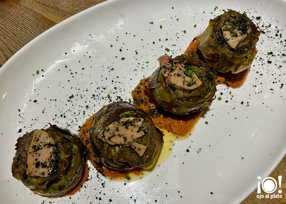 Como ya te he contado en varias ocasiones, si hay alcachofas toca pedirlas, como estas rellenas con duxelle de setas y jamón, romesco en la base y cubiertas con foie. Los ingredientes por separado ya los conoces, pues júntalos en una misma receta y tendrás algo especial.