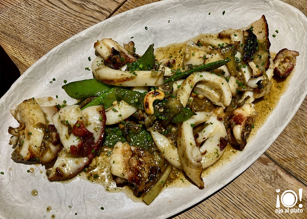 ¡Mira que pinta! La sepia bruta salteada con tirabeques y ajos tiernos, con vinagreta de anacardos y ají estaba espectacular, tierna y muy sabrosa. Además de bien acompañada con esa vinagreta tan original y esas verduras tan en su punto.