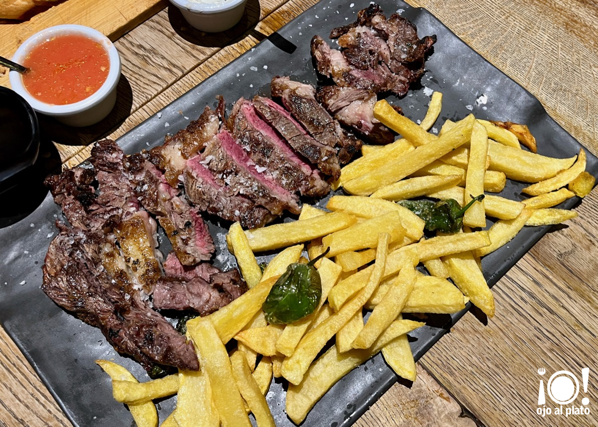 Para rematar compartimos un entrecot de vaca rubia gallega a la brasa con guarnición de patatas y pimientos de padrón. Carne excelente. A pesar de que habíamos cenado muy bien nos hubiera entrado perfectamente uno más.