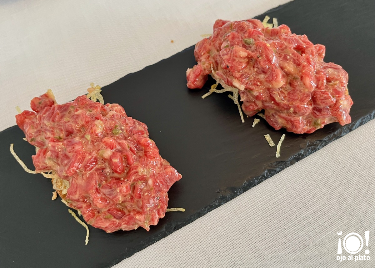 El montadito de steak tartar es una de las entradas que resultan imprescindible, es de los mejores que he probado, y llevo unos cuantos, este elaborado con carne de vacuno mayor de Luismi Premium, con un 50% de solomillo y otro tanto de encimera de chuletero de lomo alto. Tiene una consistencia más líquida que otros y resulta adictivo.