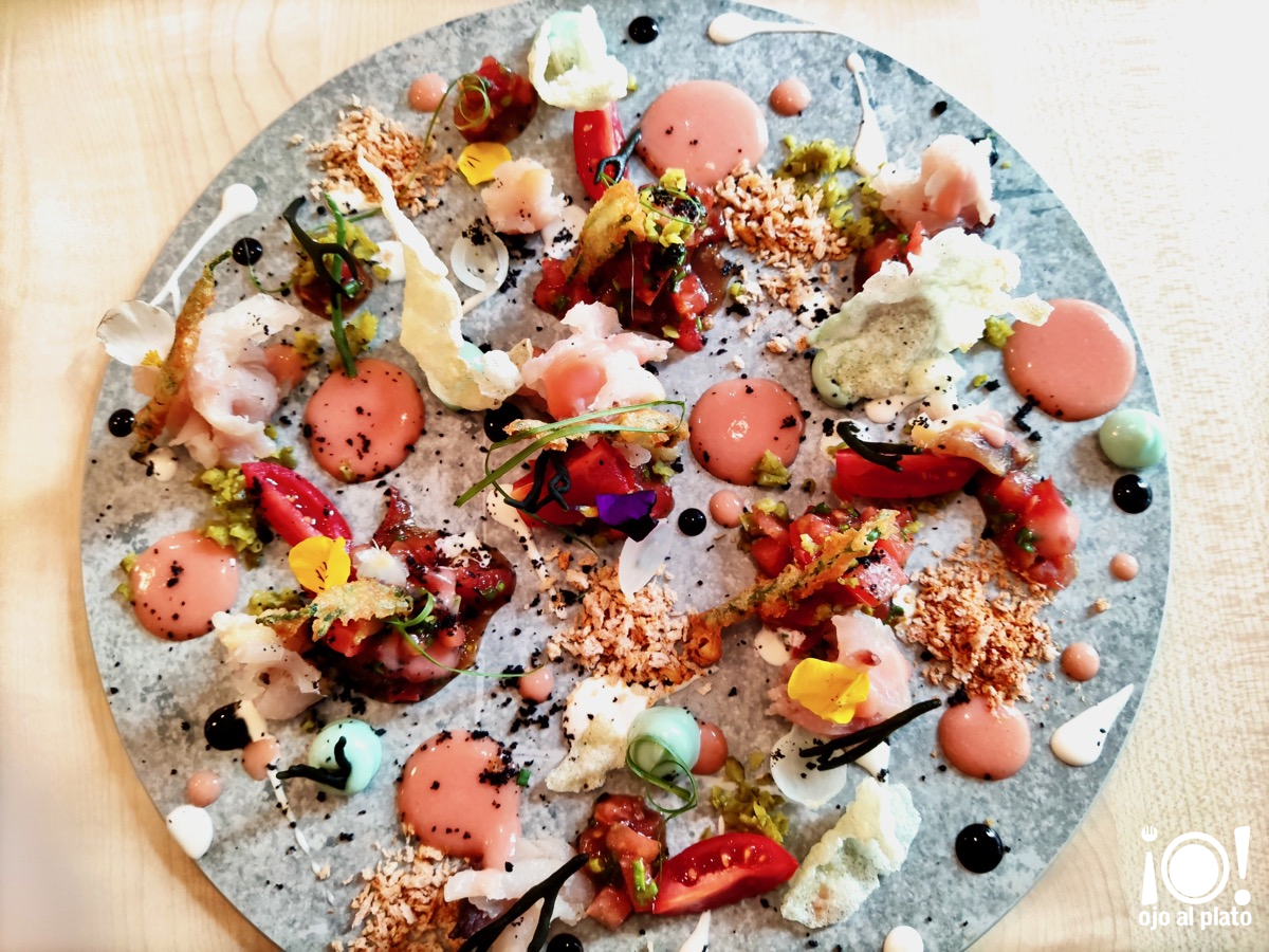 O su ensalada ilustrada. Llevaba tartar de tomate valenciano, bonito en semi salazón, tomate cherry, cebolla encurtida, pan de algas, crema de tomate fresco,aceto balsámico, migas de pan saborizado con ajo, algas codium, guindillas dulces en tempura, etc... (2022).