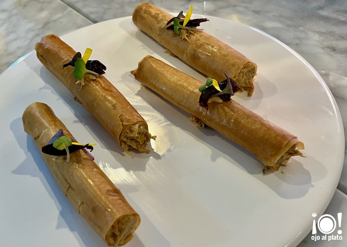 Empezamos la comida con algo aparentemente sencillo, pero que al probarlo se nos reveló como muy exquisito y que nos gustaría tener la habilidad suficiente para hacerlo en casa estas navidades, se trata de unos "Canutillos de pasta filo rellenos de pollo de corral, maíz y ciruelas pasas".