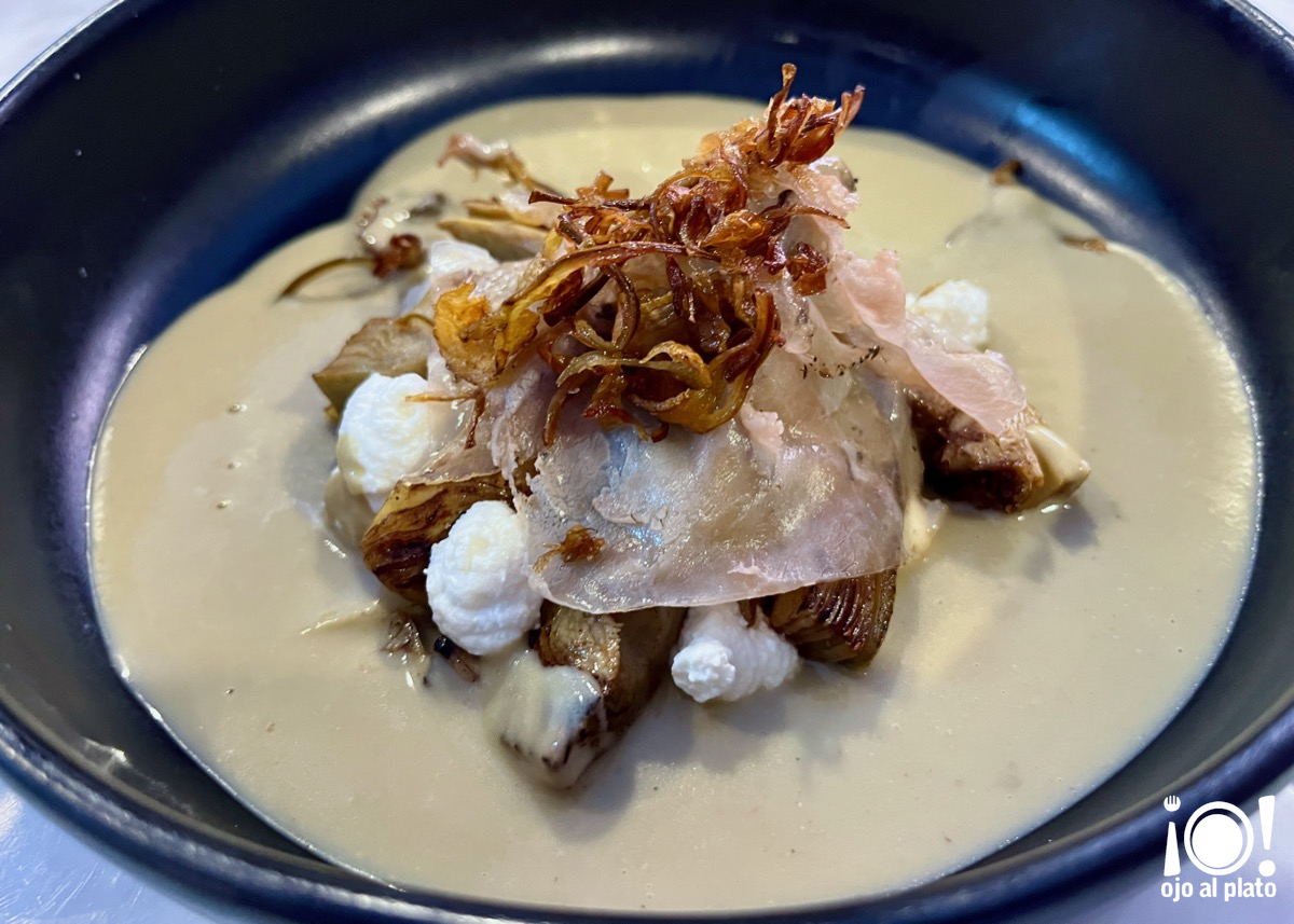 Una cocina de producto, de mercado, mediterránea e inteligente, cuando llegan las alcachofas las incorpora a su carta. Y además con atractivo y seducción, como estas "Alcachofas en texturas (confitadas, crujientes y en velouté) con guanciale y requesón". Todo un espectáculo de sabor.