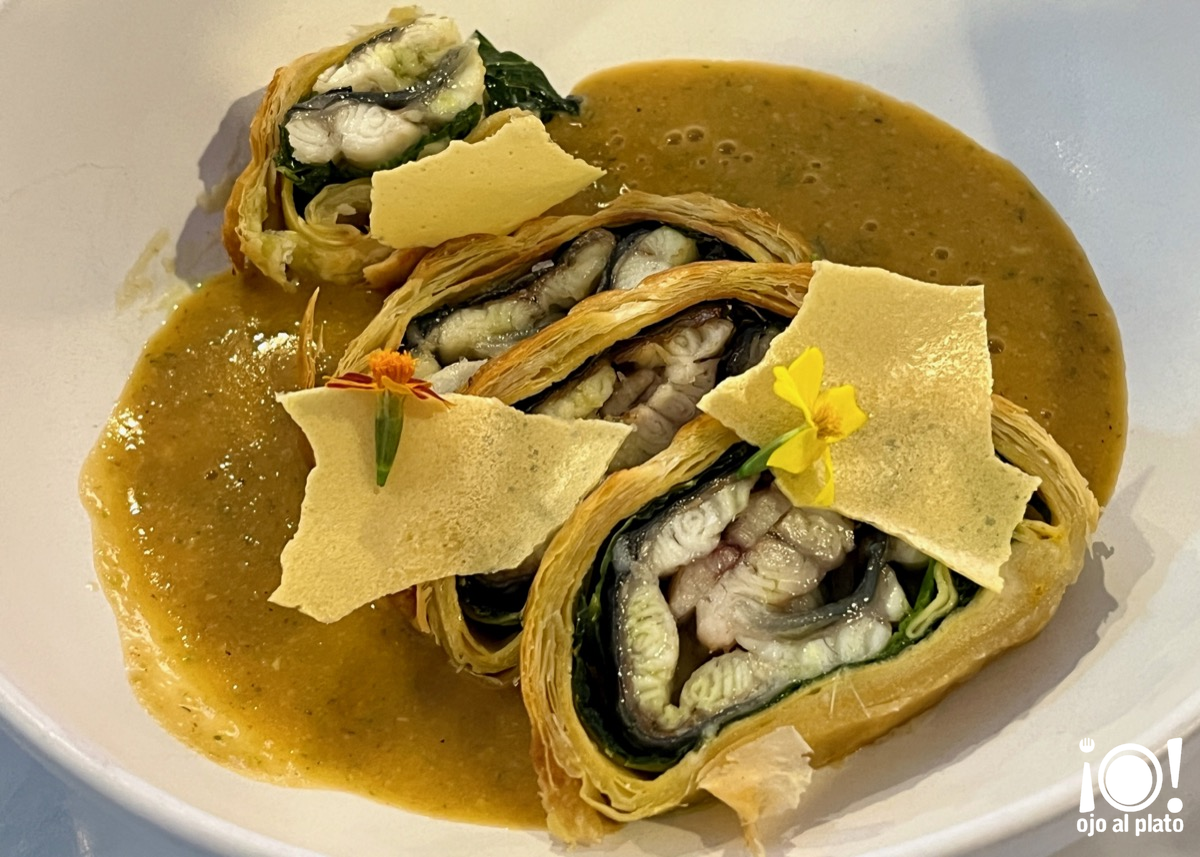 Este plato es el resultado de un concurso en el que participó Amparo Nacher en Catarroja, cuna del "all i pebre". La creatividad debe ser algo innato en una buena cocinera. Nos ofreció un "Wellington de anguila en dos elaboraciones, ahumada y a baja temperatura, con espuma de patata y salsa all i pebre", una versión muy lograda de la famosa receta del solomillo.