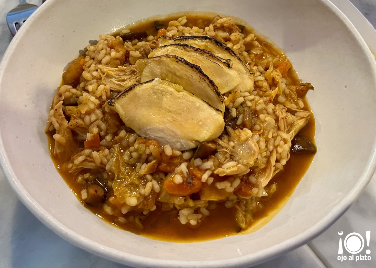 Descubrir los arroces de Xaruga ha sido todo un acontecimiento, da lo mismo que sean secos como en aquella ocasión anterior en la que nos ofreció un arroz de salmonetes, emulsión de mostaza y hierbas frescas. En esta nueva oportunidad hemos probado un arroz meloso de pularda con verduras y setas. Para chuparse los dedos. Salen sabrosos y en un punto perfecto.