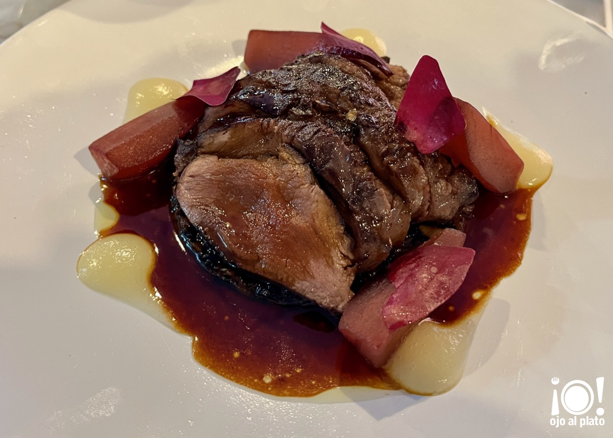 Acabamos la parte salada con un exquisito "Lomo de ciervo macerado en vino tinto con duxelle de setas y peras con cardamomo". Dicen que esta carne es dura, para nada, cuando se sabe tratar sale fantástica.