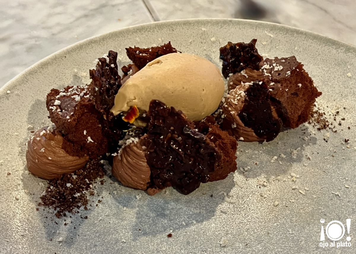 Uno de los postres es también un asiduo de mis visitas. Ganache de chocolate Guanaja de 70%, tenemos una mousse de chocolate de cobertura, encima hay un helado de chocolate con leche de 38% y a los lados una arena de cacao y bizcocho de chocolate. Hay grué en láminas, es un producto que sale de la corteza del cacao. Se prensa y se carameliza. Puro es muy amargo, pero como está caramelizado tiene un final, solo un final, amargo. Un postre que engancha.